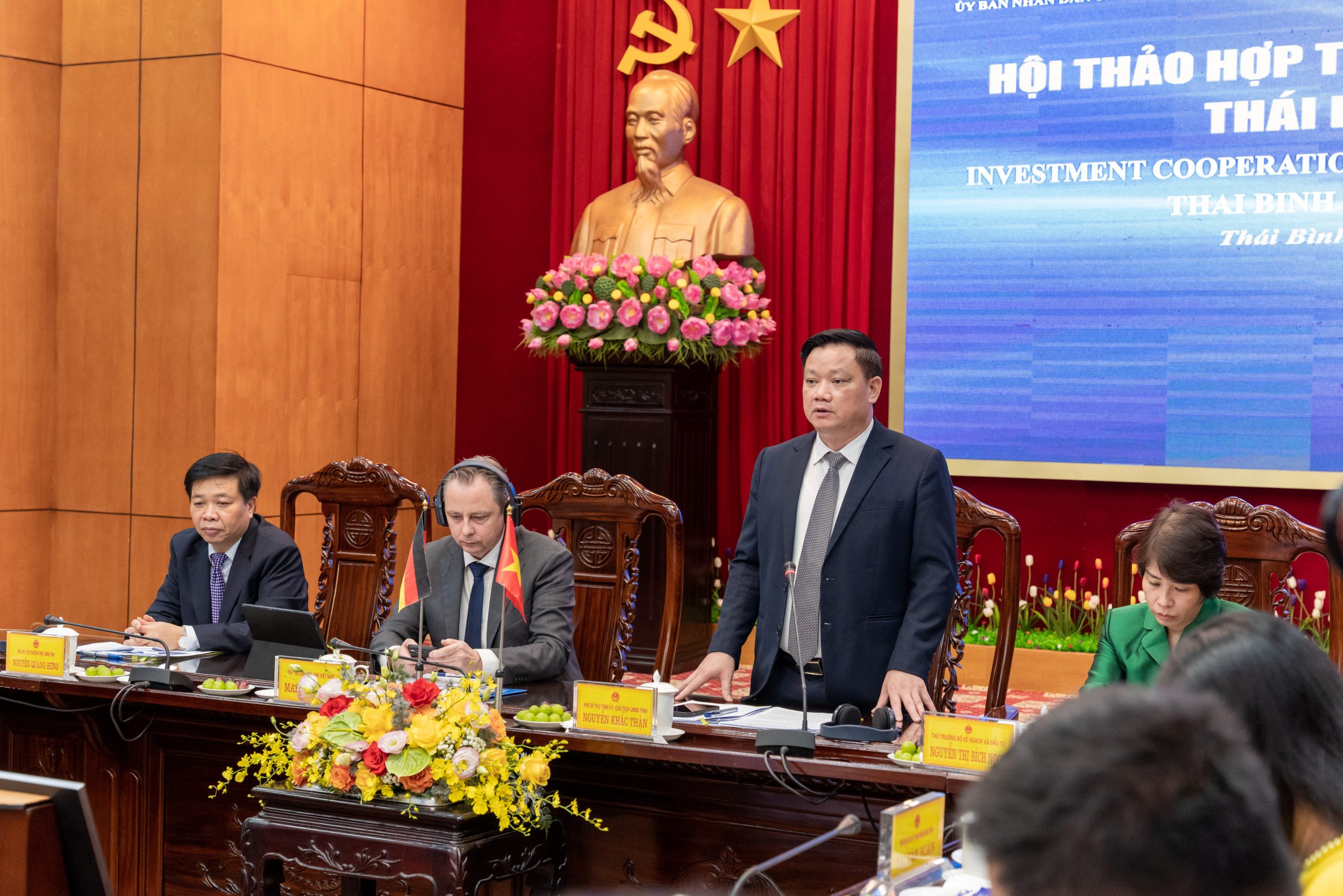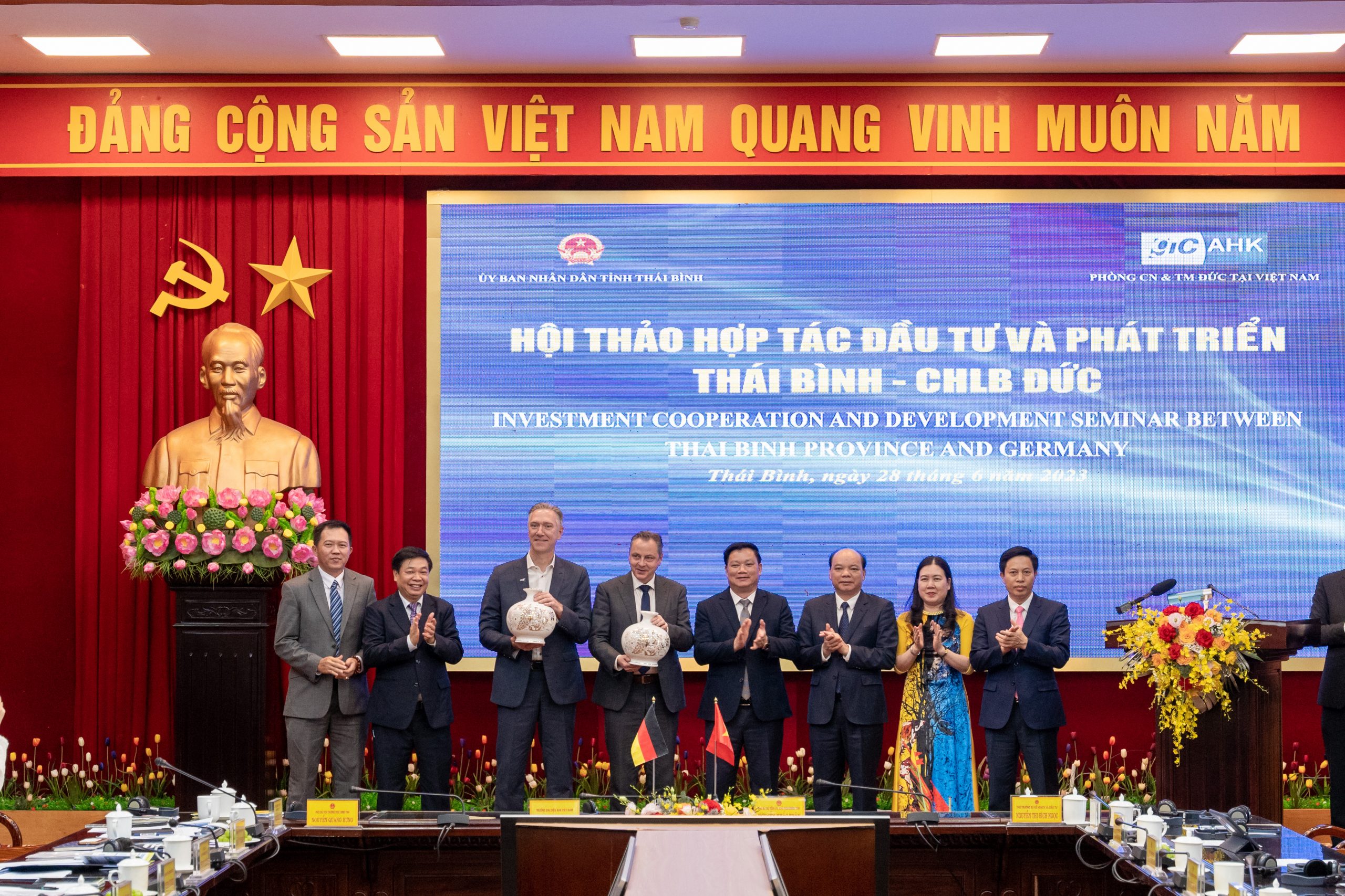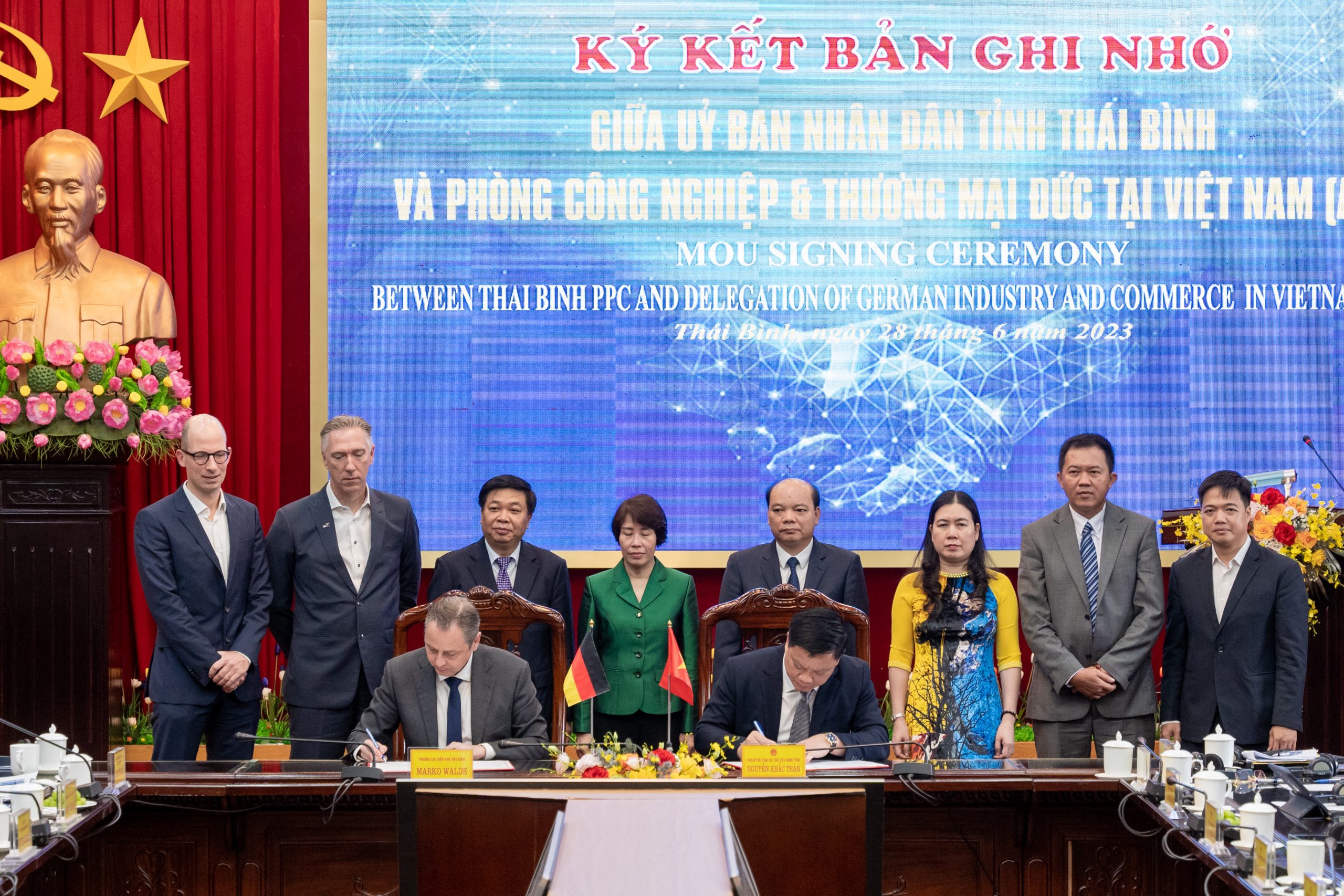 On June 28, the German delegation led by Chief Representative of AHK in Vietnam, Myanmar, Cambodia, and Laos/ Vice Chairman of the German Business Association (GBA) – Mr. Marko Walde, GBA Board members – Mr. Christoph Andermann and Mr. Andre de Jong, together with representatives from Ministries (Deputy Minister of Planning and Investment – Ms. Nguyen Thi Bich Ngoc and Deputy Director of the Ministry of Foreign Affair – Mr. Nguyen Nhu Hieu), Chairman of the Provincial People’s Committee of Thai Binh – Mr. Nguyen Khac Than, and the leaders of related departments and agencies, gathered in Thai Binh province for a strategic conference on investment opportunities.