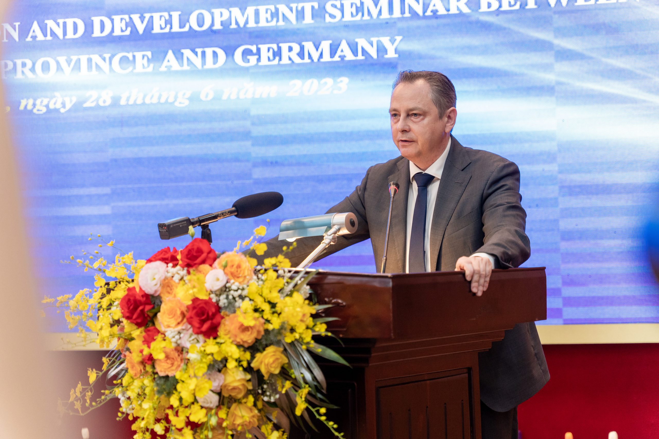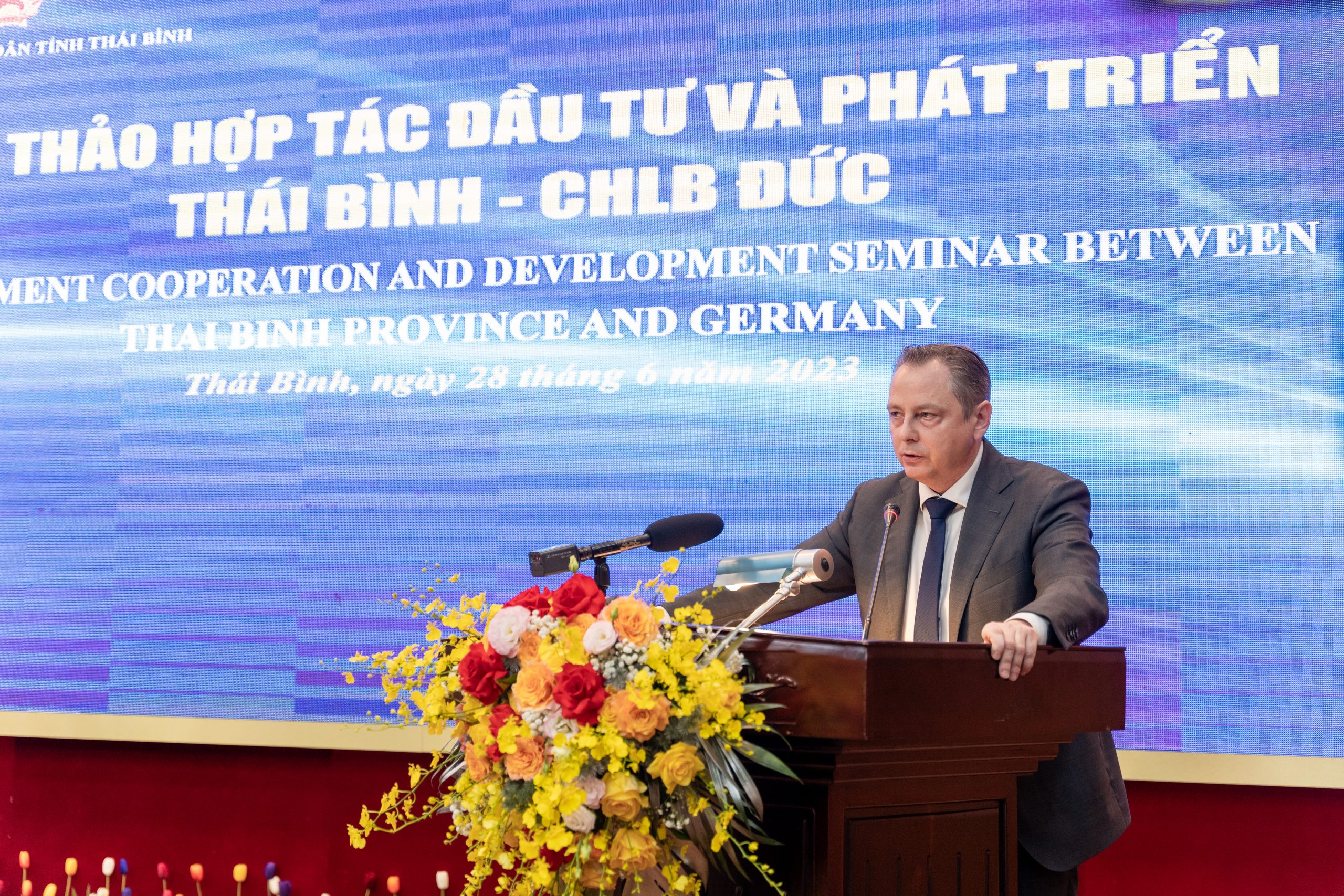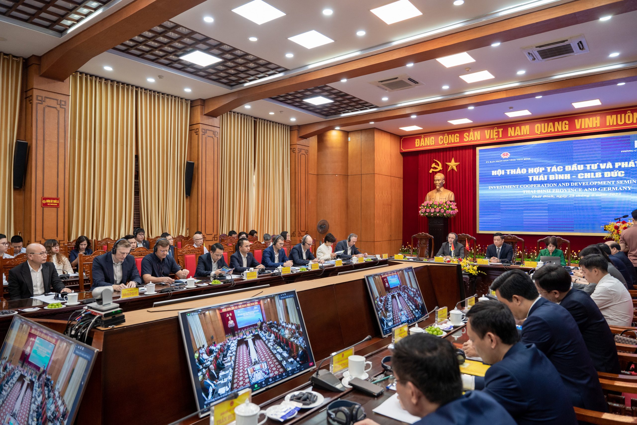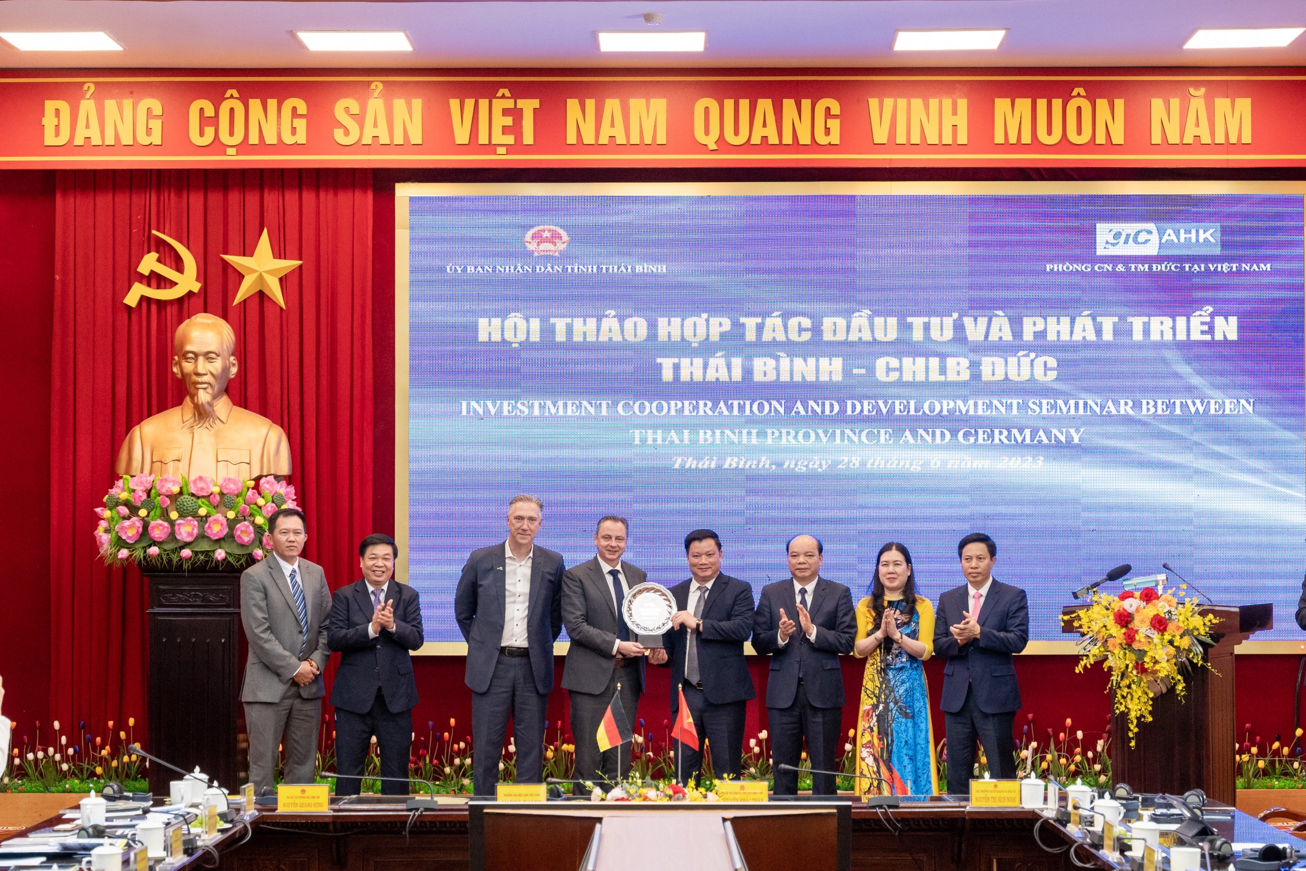 On June 28, the German delegation led by Chief Representative of AHK in Vietnam, Myanmar, Cambodia, and Laos/ Vice Chairman of the German Business Association (GBA) – Mr. Marko Walde, GBA Board members – Mr. Christoph Andermann and Mr. Andre de Jong, together with representatives from Ministries (Deputy Minister of Planning and Investment – Ms. Nguyen Thi Bich Ngoc and Deputy Director of the Ministry of Foreign Affair – Mr. Nguyen Nhu Hieu), Chairman of the Provincial People’s Committee of Thai Binh – Mr. Nguyen Khac Than, and the leaders of related departments and agencies, gathered in Thai Binh province for a strategic conference on investment opportunities.