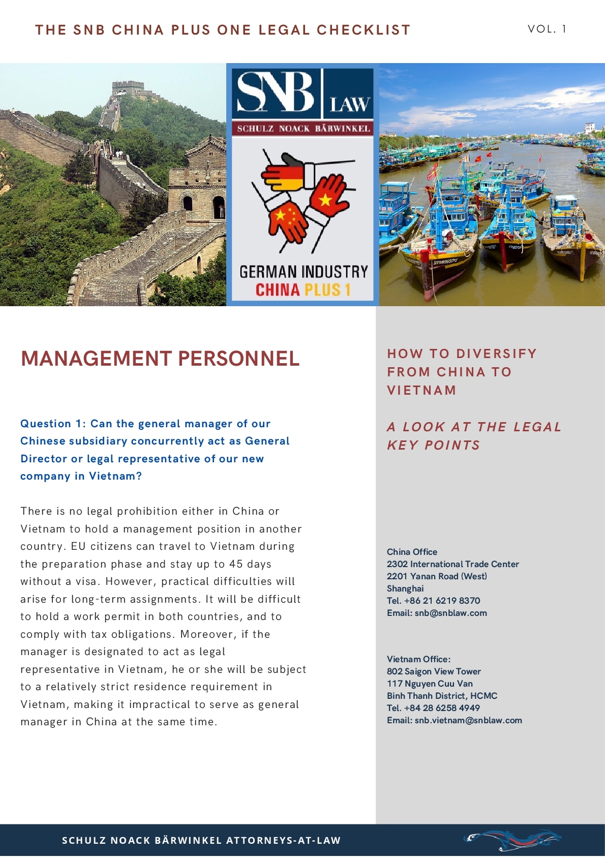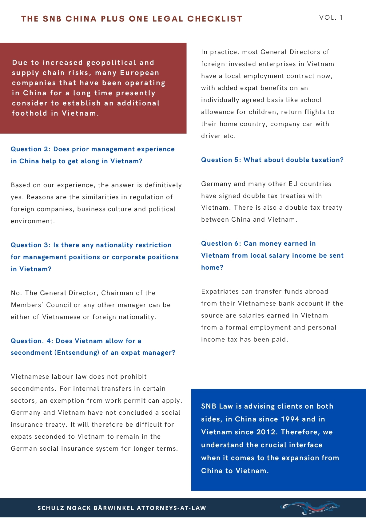 SNB Law is advising clients on both sides, in China since 1994 and in Vietnam since 2012. Therefore, we understand the crucial interface when it comes to the expansion from China to Vietnam. You will find more information through our website: https://en.snb-law.de/