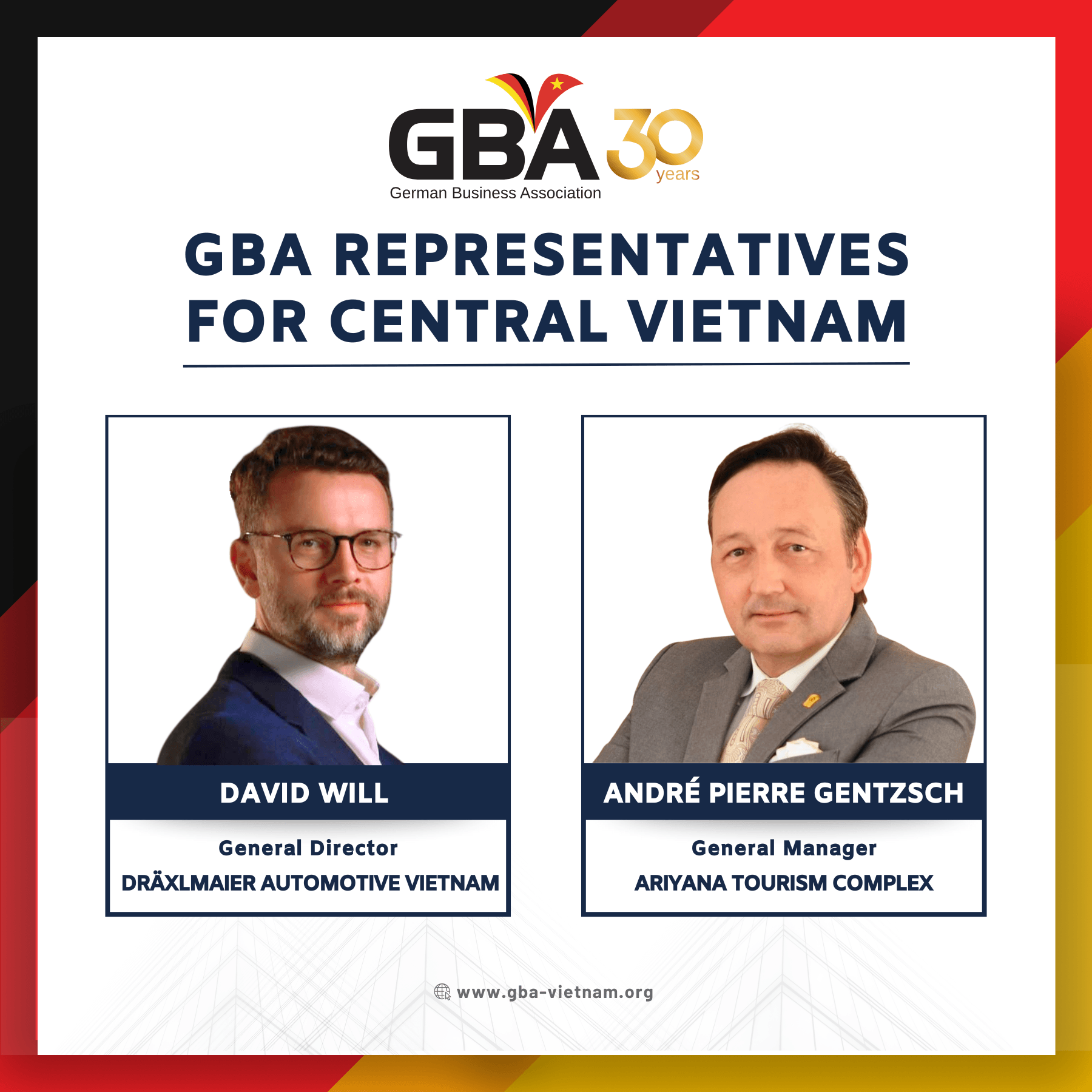 In line with our Strategy 2025 and our commitment to strengthening our presence in Central Vietnam, we are expanding our footprint through dedicated representatives. We are therefore delighted to announce the appointment of Mr. David Will – General Director of Dräxlmaier Automotive Vietnam, and Mr. André Pierre Gentzsch – General Manager of Ariyana Tourism Complex, as GBA Representatives for Central Vietnam, effective April 1st, 2025.