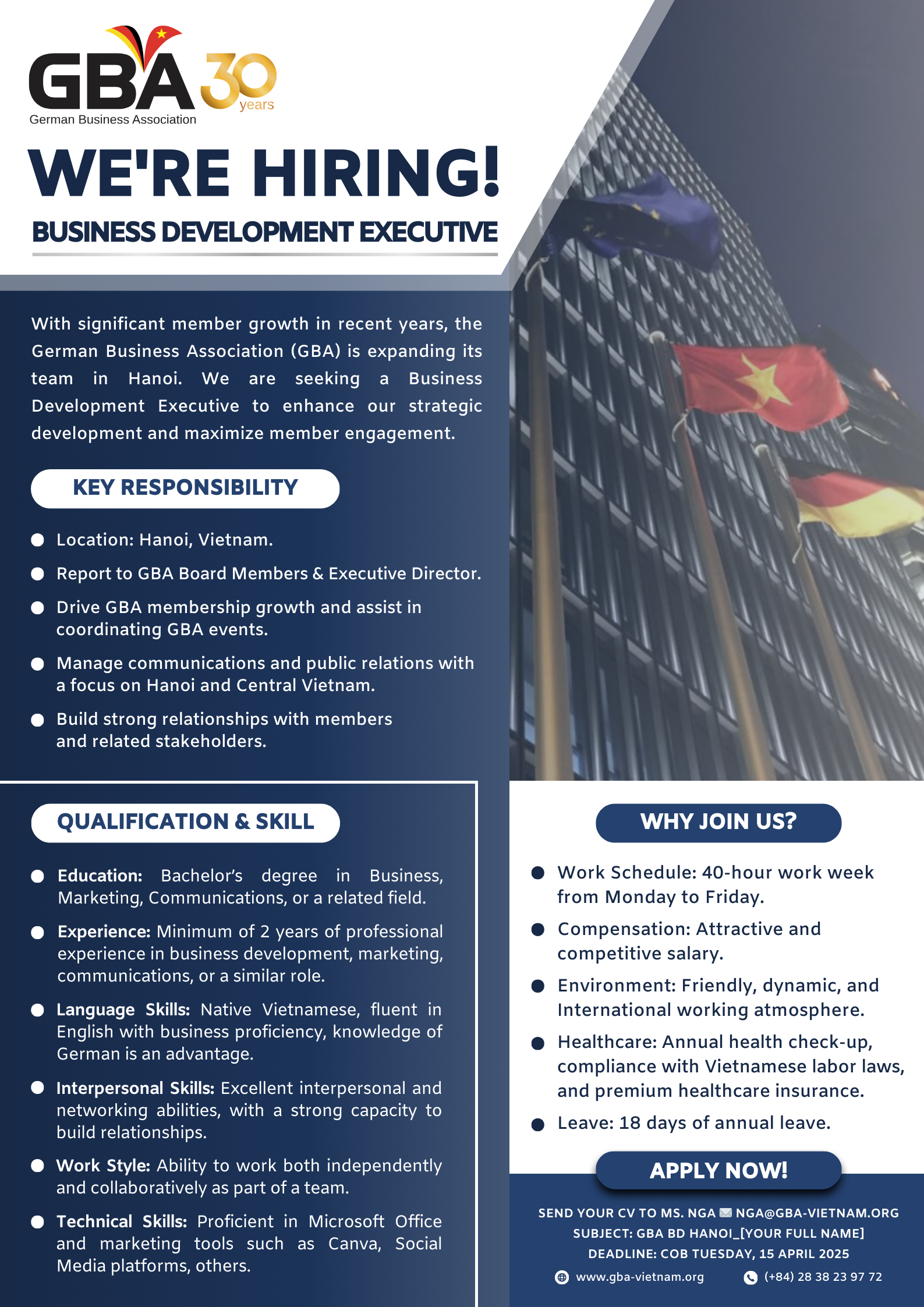 With significant member growth in recent years, the German Business Association (GBA) is expanding its team in Hanoi. We are seeking a Business Development Executive to enhance our strategic development and maximize member engagement.