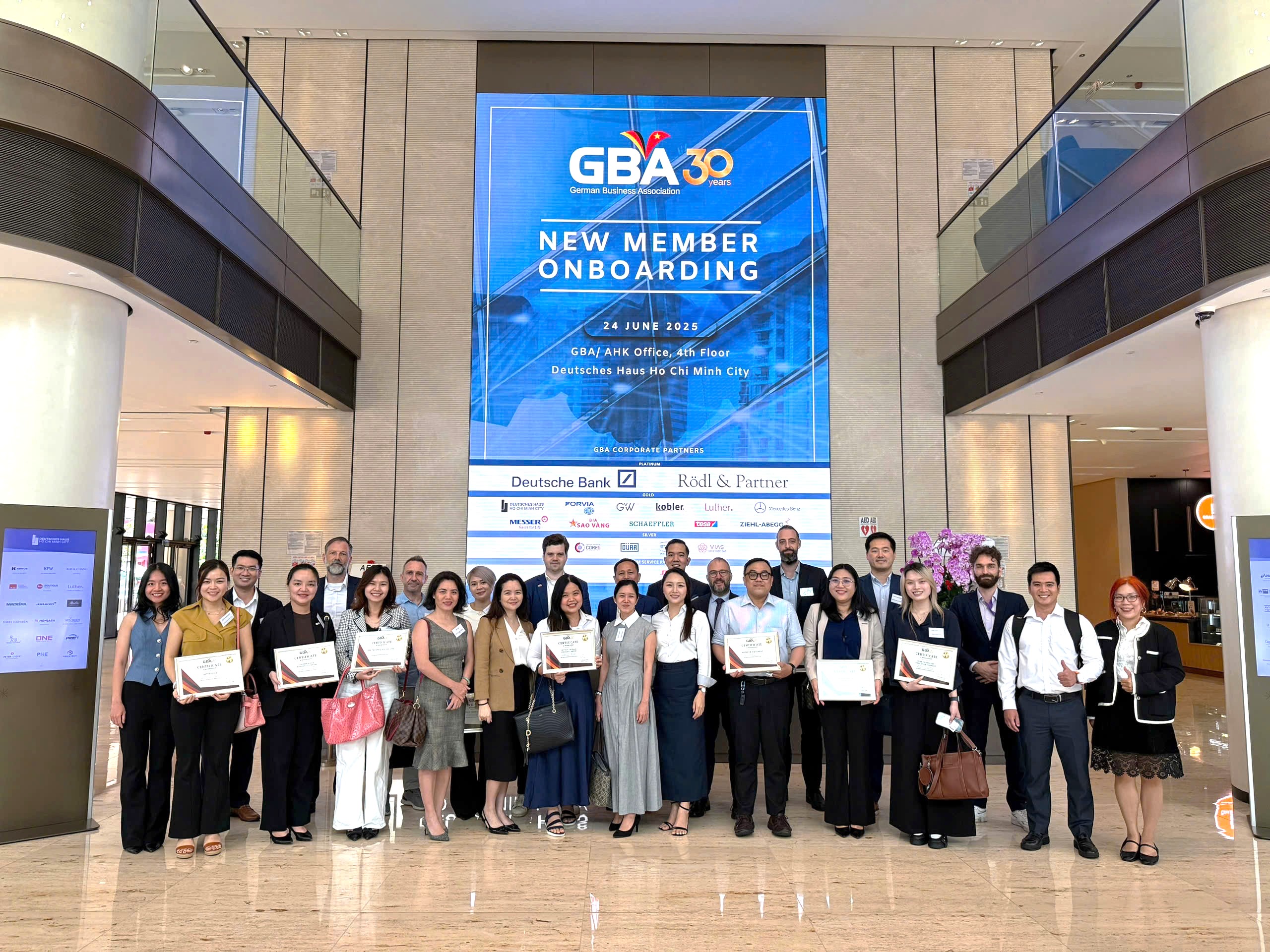 HCMC, June 24 – A warm welcome to the 25 new members who joined the GBA community in our Quarter 2 of the New Member Onboarding. This signature quarterly session offered newcomers valuable insights into the GBA’s mission, strategic priorities, and the many benefits of membership. Held at Deutsches Haus Ho Chi Minh City, the session was honored by the presence of GBA Chairman Mr. Alexander Ziehe, GBA Board Member Mr. Erick Contreras & Mr. Michael Wekezer, GBA Executive Director Mrs. Quynh Anh Le and Representative of AHK Vietnam, Ms. Cat Tuong Ngo.